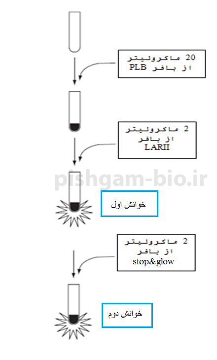 برای سنجش میزان فعالیت لوسیفراز،ابتدا سلولهای هر خانه را با 30 میکرولیتر از بافر PLB موجود در کیت لیز میشوند. سپس 20 میکرولیتر از این لیز سلولی را در لوله های مخصوص ریخته و با خواندن میزان نشر نور توسط دستگاه از عدم بیان لوسیفراز مطمئن میشویم. سپس 2 میکرولیتر از بافر LARII که حاوی سوبسترای لوسیفرین است، اضافه میکنیم و به سرعت نشر نور اندازهگیری میشود. در مرحله بعد به سرعت به لوله فوق 2 میکرولیتر بافر stop&glow که حاوی سوبسترای کوئنترازین است، اضافه میکنیم و به سرعت نشر نور اندازهگیری میشود. مراحل انجام کار بهصورت شماتیک در شکل زیر آمده است.