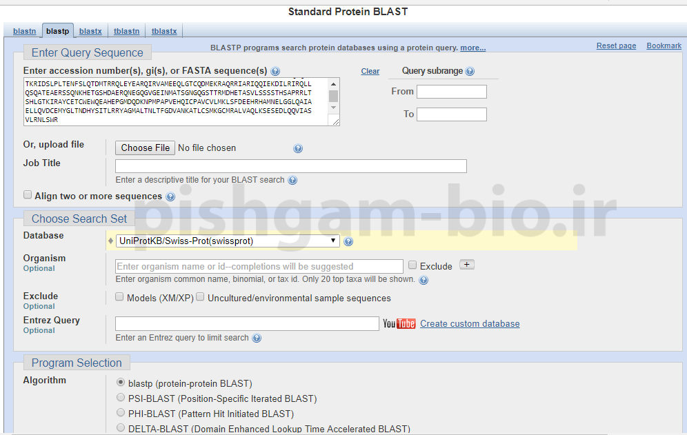 بعد از کلیک بر روی گزینههای smartBLAST و یا BLAST به صفحه اصلی بلاست پروتئین وارد میشوید.