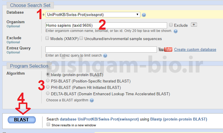 2: در قسمت Organism اسم یک گونه را وارد نمایید تا جستجو در توالیهای پروتئینی آن گونه انجام شود. در صورتی که هیچ گونه را وارد ننمایید از توالی پروتئینی همه موجودات برای بلاست استفاده میشود.