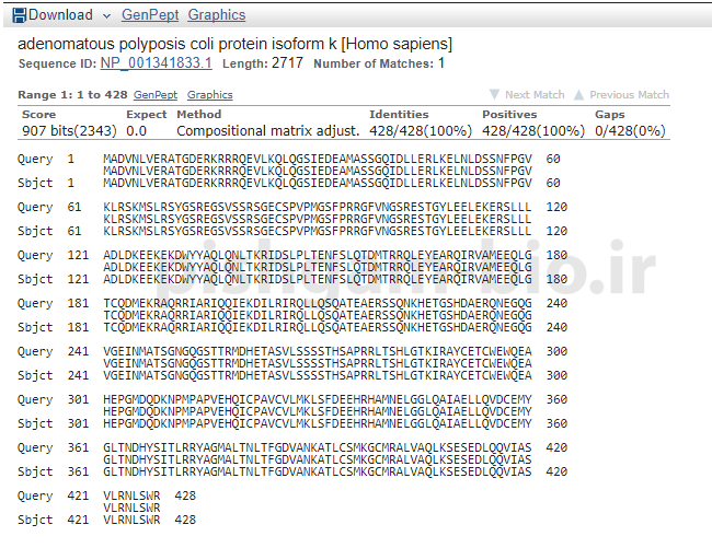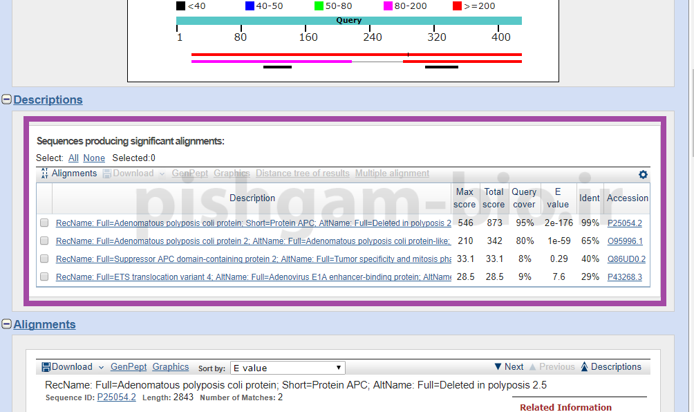 و در این قسمت میتوان هم ردیفی توالی پروتئینی مورد بررسی را با توالی پروتئین ای که مشابه آن میباشد مشاهده نمود.