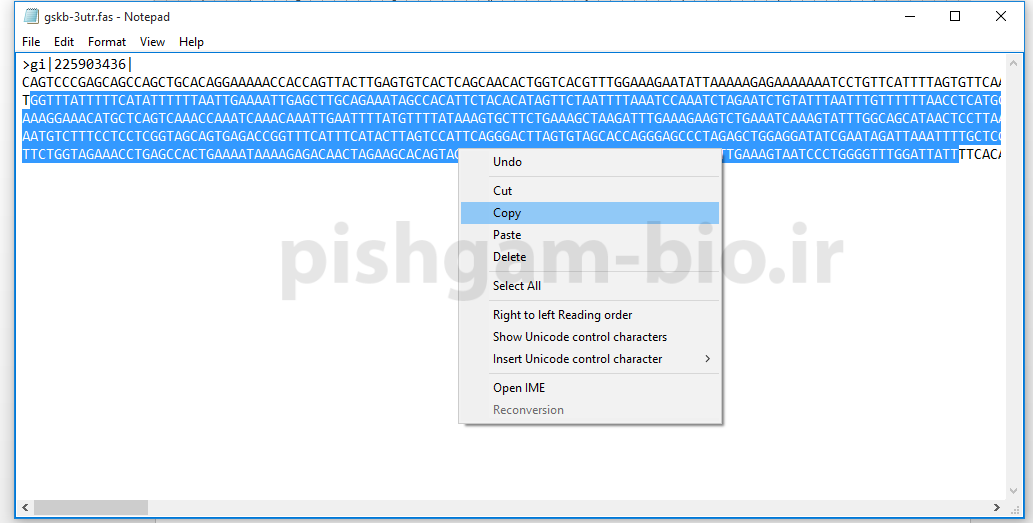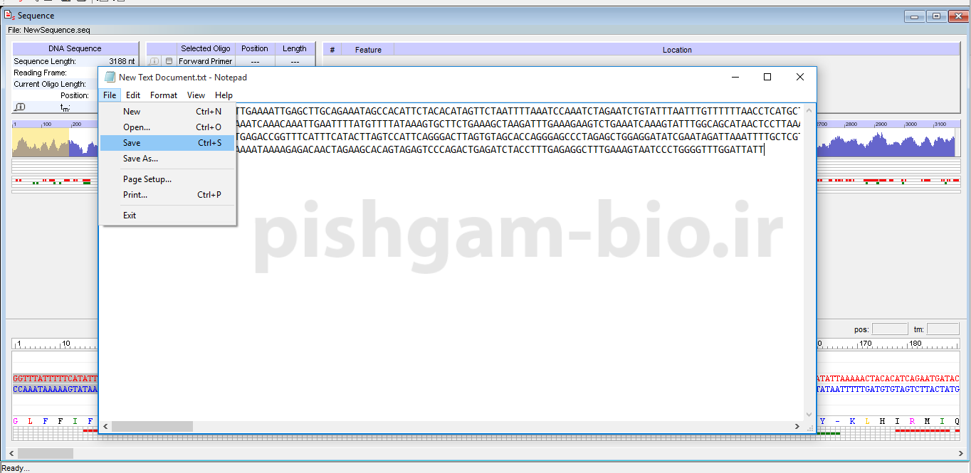 شکل7: درست نمودن فایل notepad برای ذخیره توالی درون آن و سپس معرفی آن به نرم افزار (فقط فایل را باز کنید و توالی را درون آن past کنید و سپس با دکمه های ctrl + s ان را ذخیره نمایید)
