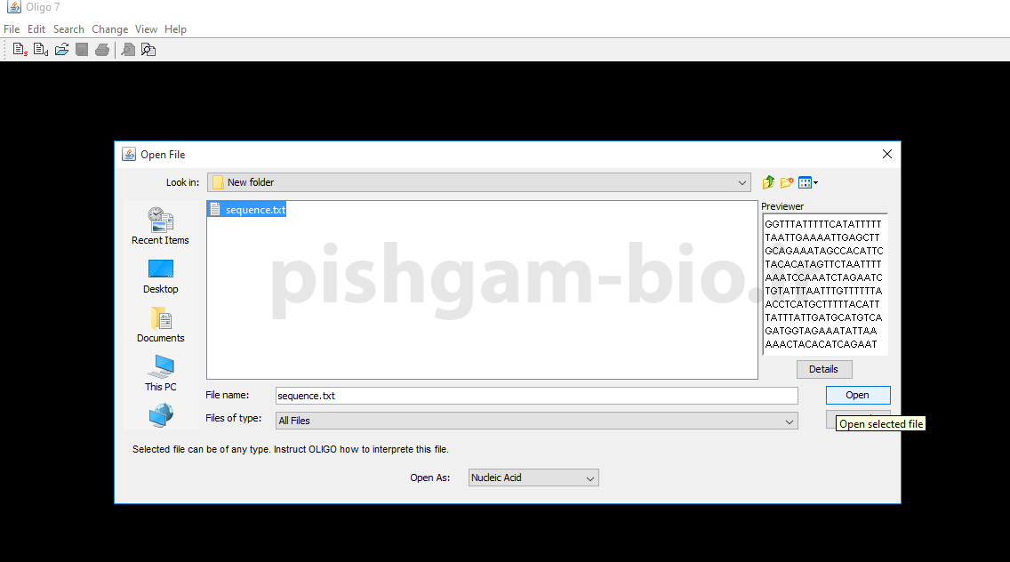 شکل 10: باز کردن فایل حاوی توالی درون نرم افزار oligo 7( اگر فایل توسط نرم افزار قابل خوانده شدن باشد توالی ژن در سمت راست در کادر previewer نمایش داده خواهد شد)