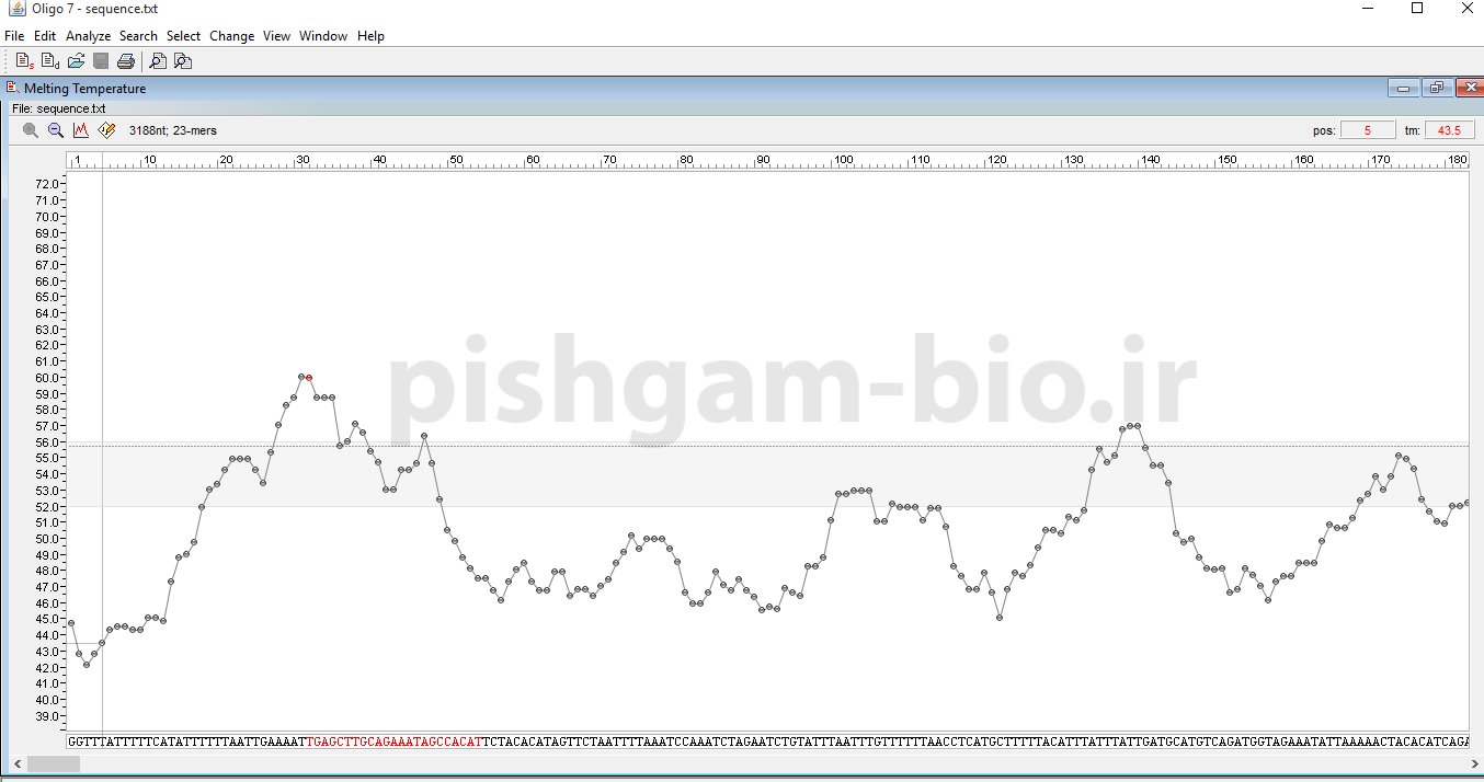 شکل 14: پس از دبل کلیک کردن برروی نواحی قله مانند وارد این صفحه میگردید. در این صفحه شما شاهد منحنی دمای Tm، توالی ژن در پایین صفحه، شمار نوکلئوتید ها در بالای صفحه و دمای Tm برای هر نوکلئوتید در سمت چپ می باشید.( توجه اگر طول پرایمر را کم یا زیاد کنید دمای Tm هر نوکلئوتید نیز کم یا زیاد خواهد شد). حالا سوال این است که کدام نوکلئوتید برای شروع پرایمر انتخاب کنم؟ اگر به دقت به عکس فوق نگاه کنید متوجه میشوید که نرم افزار یک محدوده دمایی را برای این توالی هایلات خاکستری نموده است (محدود 52 تا 56) بنابرا ین بهترین نقطه برای شروع طراحی پرایمر نوکلئوتیدهایی هستند که درون این ناحیه قرار گرفته اند.