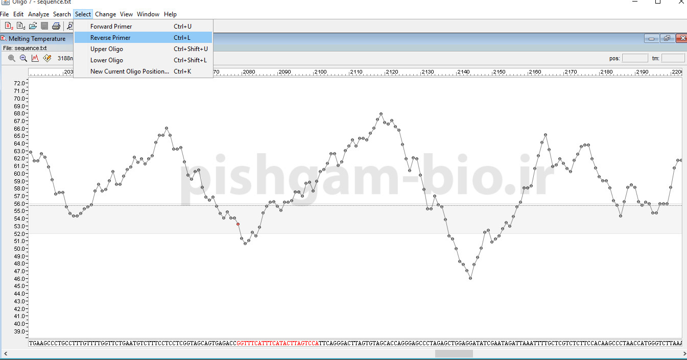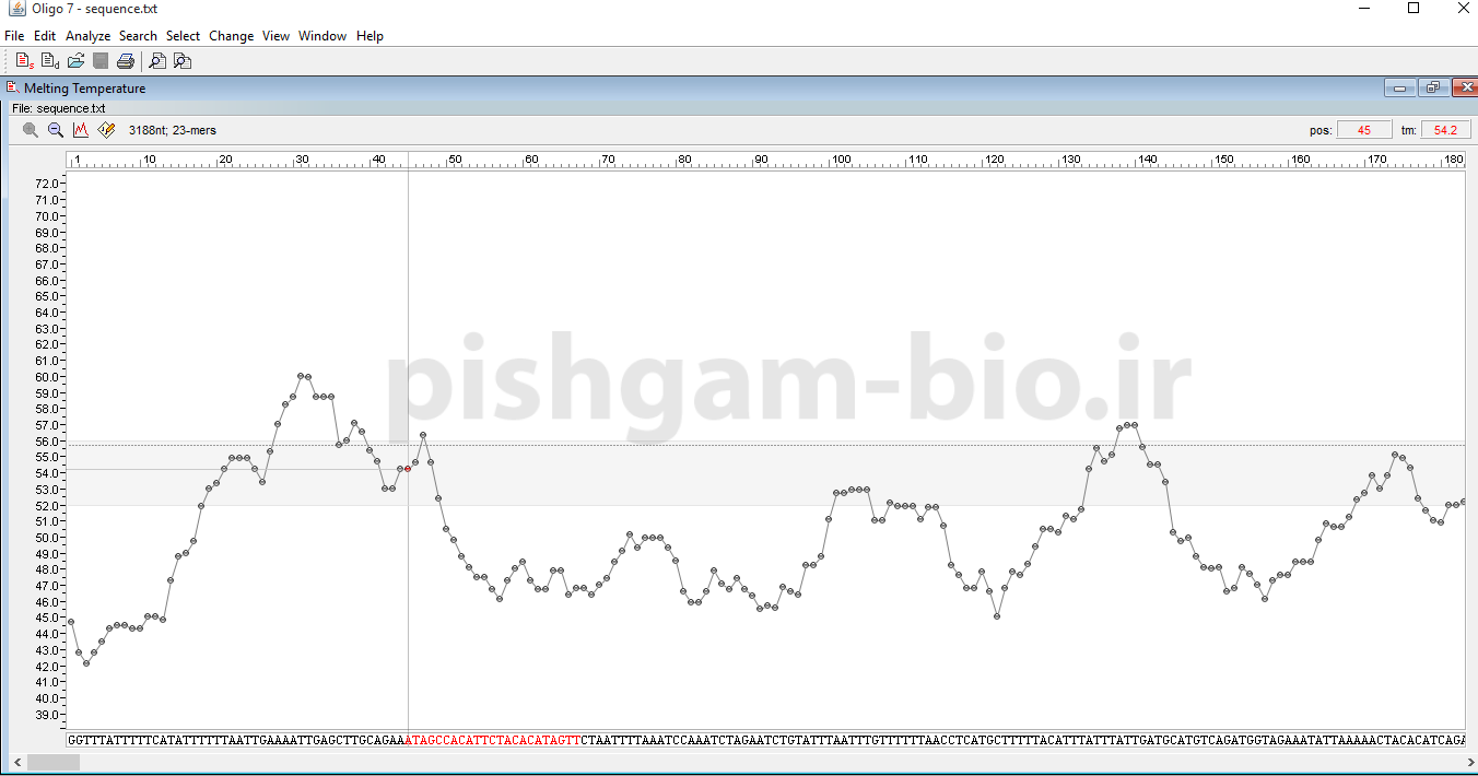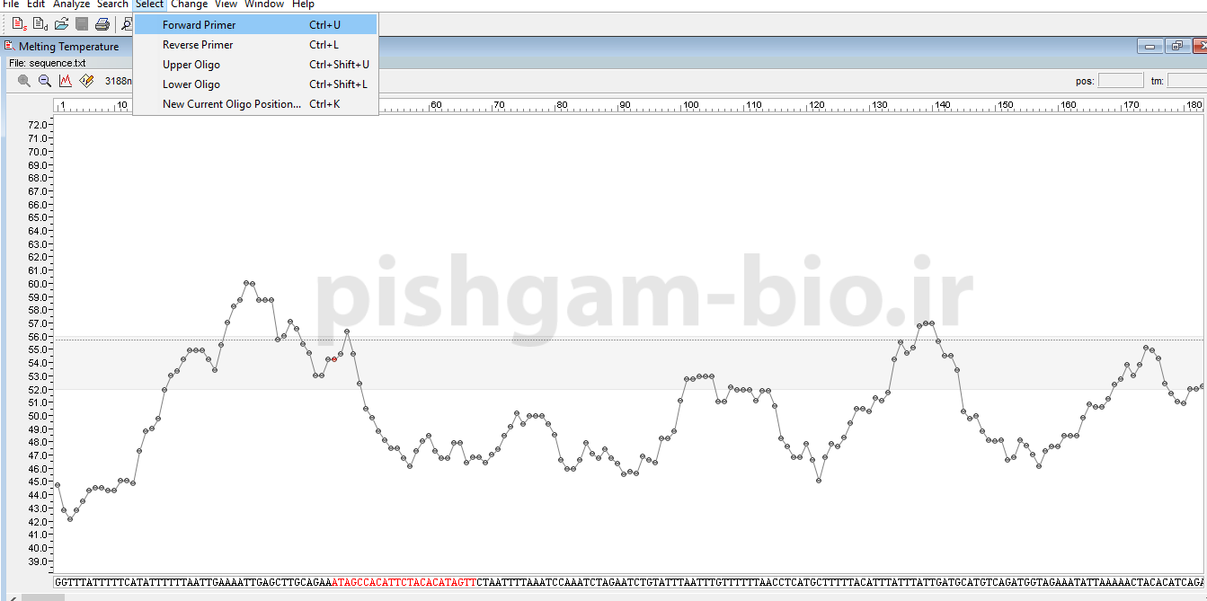 شکل 15: در این قسمت من نوکلئوتید شماره 45 را جهت نقطه شروع پرایمر انتخاب کرده ام (با کلیک برروی دایره روی منحی). با انتخاب این نوکلدوتید برای شروع پرایمر، توالی پرایمر در قسمت پایین به صورت قرمزنگ در می اید. توجه داشته باشید که طول پرایمر را قبلا انتخاب نموده اید بنابراین با انتخاب نوکلئوتید اول کل پرایمر مشخص میشود. و باز توجه داشته باشید که نوکلئوتید 45 به صورت دلخواه انتخاب شده است اما دارای دو شرط برای انتخاب می باشد: دارای Tm مناسب و دارای طول مناسب می باشد. اما باقی شروط طراحی پرایمر باید برای آن (مانند عدم تشکبل ساختار سنجاق سری) چک شوند. شما نیز میتوانید در نقطه دلخواه خود به عنوان مثال ابتدای ژن یا ابتدای اگزون نقطه را برای پرایمر انتخاب کنید که داری دارای Tm مناسب و دارای طول مناسب می باشد (توجه کنید که اگر Tm نقطه دلخاه شما کم بود میتوانید طول پرایمر را افزایش دهید).