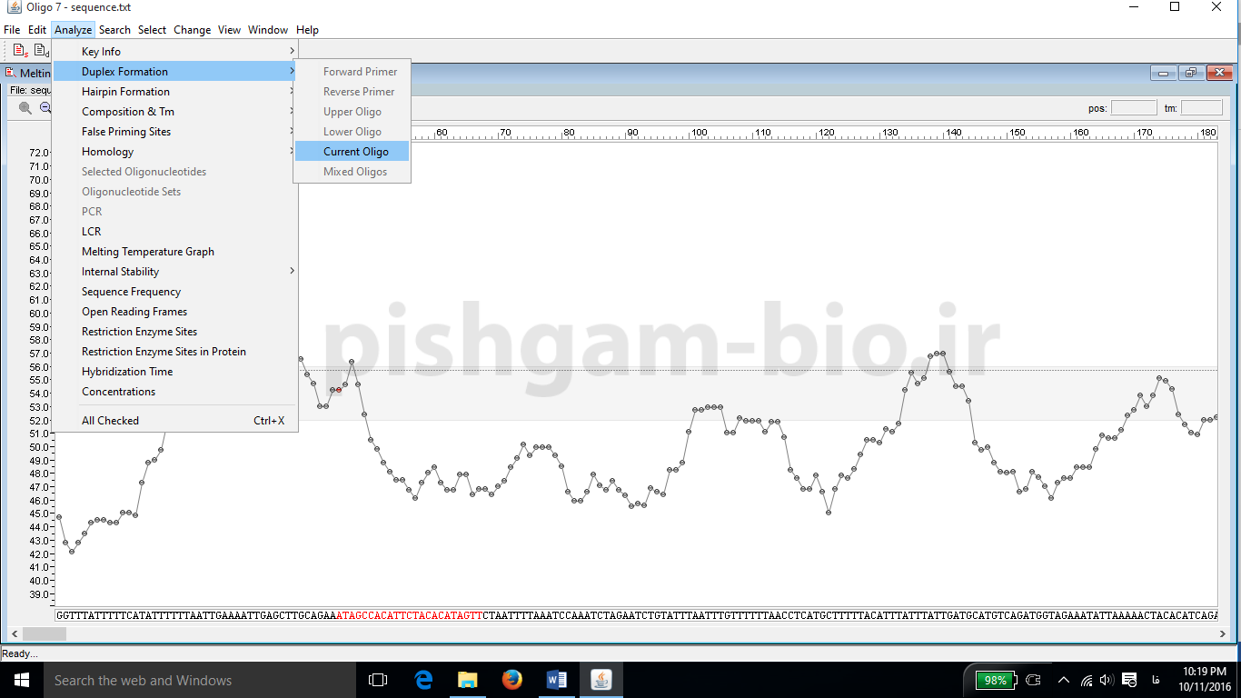 شکل 16: حال که پرایمر انتخاب شده داری طول و دمای مناسب است باید سایر ویژگی های آن نیز چک شود مانند تشکیل سنجاق سر. براین این کار از منوی analyze عمل میکنیم تا ناحیه ای که برای پرایمر شدن انتخاب کرده ایم (current oligo) را مورد بررسی قرار بدهیم.