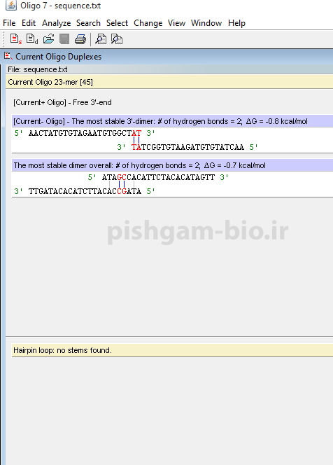 شکل23: باید توجه داشت که در انتهای 3/ دو پرایمر بیش از 3 باز جفت نشوند و در مجموع هرچه قدر که تعداد این جفت شدهگی ها کمتر باشد پرایمرهای ما بهتر هستند. در مجموع شکل فوق یک جفت پرایمر با جفت شدگی تقریبا متوسط را نشان میدهند که بهتر نقاط بهتری برای یکی از پرایمرها انتخاب شود تا این جفت شدگی ها کمتر شوند.