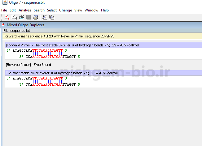 شکل 22: در نهایت بعد از انتخاب دو پرایمر باید میانکنش بین دو پرایمر با یکدیگر هم مشخص گردد