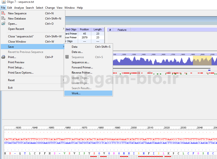 شکل 26: نحوه ذخیره کردن کارها انجام گرفته و بررسی های انجام گرفته. در صورتی که work خود را ذخیره نمایید شما یک فایل داریم که با باز کردن آن تمام آنالیزها و پرایمرهای انتخاب شده را می توانید مشاهده نمایید و کارهای تکمیلی خود را برروی آن ها انجام دهید. همچنین در منو میتوانید توالی پرایمرهای فوروارد و معکوس را ذخیره نمایید