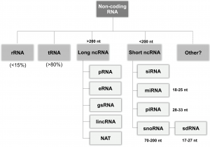این گروه از RNA ها به طور کلی طولی بین 20 تا 300 نوکلئوتید دارند. این گروه از ncRNAها را به انواع siRNA ، rasiRNA ، snoRNA و غیره تقسیم بندی کرده¬اند. siRNAها به عنوان محصولات پردازش شده¬ی RNAهای طویل دو رشتهای می¬باشند]36[. rasiRNA¬ها از نواحی تکراری ژنوم مثل ترانسپوزون¬ها منشا می¬گیرند و عملکردی شبیه به عملکرد piRNA¬ها دارند]37[. snoRNA¬ها گروهی از ncRNA¬ها هستند که در فرایند تغییر RNA¬های ریبوزومی (snRNA) و RNAهای دیگر شرکت می کنند]38[.