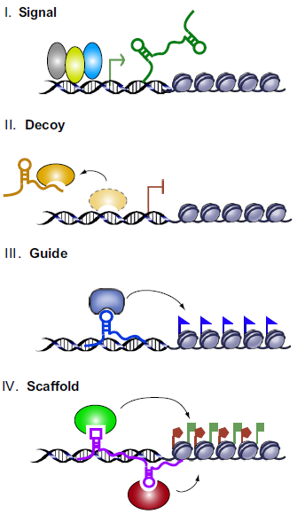 شکل: شماتیکی از مکانیسم¬های عمل lncRNAها 1) به عنوان سیگنال می¬توانند با بیان شدن به همراه فاکتورهای رونویسی سبب تنظیم بیان ژن¬ها بشوند. 2) به عنوان تله قادرند فاکتورهای رونویسی و دیگر پروتئین هایی که روی DNA تاثیر دارند را با اتصال به آن ها از اتصال به DNA دور نگه بدارند. البته برخی از lncRNA ها با دارا بودن محل اتصال برای miRNA از تاثیر آن ها بر روی اهدافشان می-کاهند. 3) به عنوان راهنما سبب می شوند که آنزیم¬های تغییر دهنده کروماتینی چه به صورت cis (در همان ناحیه¬ای که lncRNA متصل است) و چه به صورت trans بر روی اهداف خود تاثیر بگذارند. 4) به عنوان داربست سبب به هم چسبیدن پروتئین¬ها شده و یک ریبونوکلئوپروتئین را به وجود می¬آوردند که خود این قادر است انواع فعالیت¬ها را در داخل هسته انجام دهد مثل سیگنال یا تغییر کروماتین و…]39[.