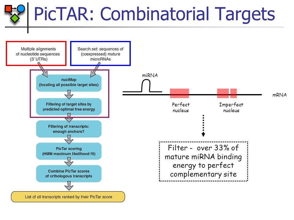 این الگوریتم یک گروه از اورتولوگ های 3`UTR از گونههای مختلف را به عنوان داده ورودی در نظر میگیرد و آنهایی را انتخاب میکند که جفت شدگی ناحیه seed با miRNA را نشان دهند و سپس از لحاظ ترمودینامیکی فیلتر شده و بر اساس روش [1]HMM، امتیاز بندی میشود. Pictar اولین نرم افزاری بود که از ویژگی هم بیانی زمانی و مکانی miRNA و هدفش استفاده میکند.