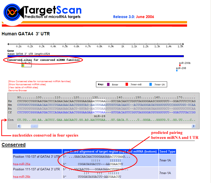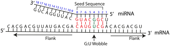 در سایر روشهای پیش بینی MREها در ژنهای هدف، ابتدا جفت شدگی احتمالی تمام قسمتهای miRNA مورد استفاده قرار می گیرد و سپس با استفاده از معیارهای دیگر کاذب مثبتها فیلتر می شوند ولی در روش Target scan ابتدا جفت شدگی کامل برای ناحیه seed جستجو و سپس به نواحی اطراف بسط داده میشود. به این ترتیب بسیاری از پاسخهای مثبت کاذب از همان ابتدا فیلتر میشوند. Target scan اولین نرم افزاری بود که برای پیش بینی اهداف miRNAهای انسانی به کار گرفته شد. در این نرم افزار از ژنوم موش، موش صحرایی و ماهی برای بررسی حفظ شدگی استفاده میشود. میزان مثبت کاذب در این نرم افزار حدود 22 تا 31 درصد در نظر گرفته شده است. جفت شدگی miRNA در اینجا محدود به 6 نوکلئوتید ناحیه seed و سپس انطباق ناحیه 3` و اولین نوکلئوتید آدنین می باشد. البته، به خاطر جفت شدگی قوی مورد نیاز در ناحیه seed، هدفهایی که دارای حفاظت شدگی ضعیف هستند و یا دارای یک حباب در ناحیه جفت شدگی باشند از دست میروند.